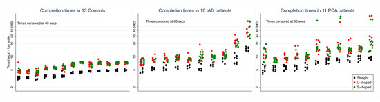 Some patient participants were unable to complete the task within 60 s in a small number of trials (a total of 8 trials across 3 PCA patients; 3 trials for a single tAD patient). Owing to the rarity of these uncompleted trials, no formal statistical analysis of accuracy was performed. See Figure 2 for individual completion times for each participant, including a display of the number of trials censored at 60 s. Typically, patients took around twice as long to complete trials compared to controls.