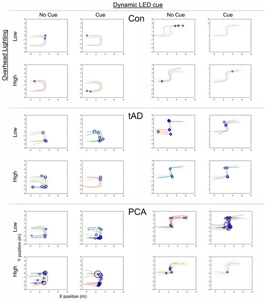 Walking paths with step-time outliers are presented in Figure 3 for the control, tAD, and PCA groups for different cue and lighting conditions.