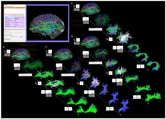 Streamline-based segmentation was performed using Tractome (http://tractome.org, accessed on 1 February 2024) [23], a software tool that supports an interactive process interleaving steps of fast clustering and steps of visual inspection and manipulation of streamlines. Similarly to TrackVis, bundle segmentation in Tractome begins with a whole-brain tractogram. Upon opening the tractogram in the software, streamlines undergo clustering, displaying a series of prototypes overlaid on the anatomical image provided. Prototypes are streamlines representative of groups of fibers with similar shapes and close spatial relationships. They provide an abstract simplification of the tractogram, enabling user interaction. Indeed, interaction with the entire set of streamlines of a whole-brain tractogram would not be viable due to the high number of streamlines that it contains. The interaction is supported by a blended mouse and keyboard control interface: while the mouse pointer defines which prototype the user is working on, a series of actions can be initiated by pressing specific keys on the keyboard. The segmentation starts with the identification and selection of the prototypes representing the bundle of interest and the disposal of irrelevant ones. Streamline-based bundle segmentation with Tractome is an iterative process. The user can adjust the number of clusters to recursively adapt the representation of the remaining set of streamlines. As the selection and elimination of irrelevant clusters progress towards the desired segmentation, the number of clusters can be increased until each individual streamline is represented and can be directly selected. This approach allows users to identify the bundle by considering the shape of the streamlines themselves, without the need to annotate MR images for indirect streamlines selection as required in ROI-based approaches. Figure 2 illustrates the process of streamline-based bundle segmentation with Tractome for the four bundles considered in this study.