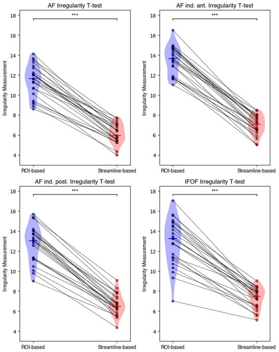 We conducted a paired t-test to determine significant differences in the mean irregularity between ROI- and streamline- based segmentation for each bundle (i.e., AF, indirect anterior and posterior segments of the AF, and IFOF). As shown in Figure 3 and reported in Table 2, the results indicated statistically significant differences for all the bundles with p < 0.001 and a large effect size as described by Cohen’s d.