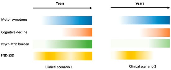Years before motor symptoms emerge, patients may present hypochondriacal manifestations or conversion disorders. In some cases, motor manifestations of PD, such as tremors or distractible and inexplicable paresis; a long history of conditions categorized as fibromyalgia [90] or chronic fatigue syndrome; and painful syndromes devoid of pathological substrates, such as Reflex Sympathetic Dystrophy, episodes of Globus pharyngis (formerly known as hysterical bolus), and pseudoseizures (psychogenic epileptic seizures), all fall under the category of Medically Unexplained Syndromes (MUS) [20,54]. Some authors estimate the prevalence of these disorders to be 10–20% [20], while others suggest that it may exceed 30–59% [85,87,91]. Figure 1 compares the timing of cognitive, psychiatric disorders and FND-SSD in two different clinical scenarios in PD.