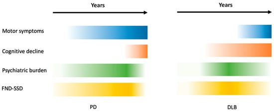 The figure emphasizes the prominent and early psychiatric and cognitive burden of DLB patients compared to PD patients. However, PD patients can present persistent, although more “subtle”, psychiatric symptoms (in particular, FND) since the earliest phase of the disease, often before the onset of motor symptoms.