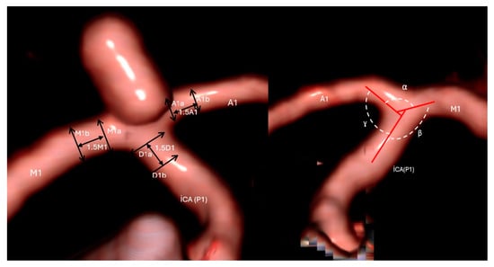 Hemodynamic stresses play a crucial role in the formation, growth, and bleeding of IAs. The apex of a bifurcation is the area where maximum stress is experienced due to the flow impact, deflection, and flow separation [,,,,]. Furthermore, hemodynamic stress is affected by the bifurcation geometry (diameter of the vessel and its angles). In our study, we found that the α angle (M1–A1), BifA (β + ɣ), P1, and BifSR were associated with ICAbifAn formation.