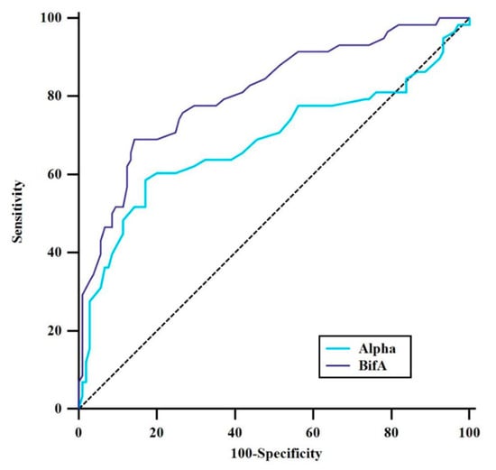 The determination of bifurcation angles in the literature greatly varies. While some studies are based on the angulation between both daughter vessels [,], other studies have used the sum of the angulations between the parent and daughter vessels [,,,]. In our current study, we evaluated both measurements and determined that both measurements were associated with the formation of ICAbifAn. Statistically, when we examined the effect of α angle and BifA, we showed that the α angle approached significance [OR, 1.054 (1.026–1.083), p < 0.001]; however, only the BifA angle retained significance after the multivariate analysis [OR, 0.911 (0.877–0.946), p < 0.001]. When these two angles, which are determinants of aneurysm formation, were subjected to ROC analysis to determine the cut-off values with optimum sensitivity and specificity, the largest AUC value of 0.81 was observed for the BifA angle, while the AUC value of the α angle was found to be 0.68. This shows that the BifA angle is a more accurate predictor of aneurysm formation than the alpha angle. The optimal cut-off values to most accurately distinguish aneurysmal from non-aneurysmal bifurcations were found to be 210° for BifA (sensitivity 0.69, specificity 0.87) and 58.8° for the alpha angle (sensitivity 0.58, specificity 0.82) (Figure 2). The reason for this difference may be the smaller angles between the parent artery and the daughter arteries (daughter arteries originating from the parent artery with sharper angles). Because the flow at the apex of the bifurcation is steep and divides into branches after the crossover, it tends to be laminar as it progresses toward the branches and reaches the highest hemodynamic stress in the small-angle artery, preceded by chaotic turbulence. This chaotic environment causes wall thickening and intimal hyperplasia in the arterial wall and, as a result, may cause aneurysm formation [,]. Therefore, when evaluating the bifurcation geometry, we think that evaluating the sum of the angles between the parent artery and the daughter branches (BifA) will be more useful than evaluating the angles between the branches (α).