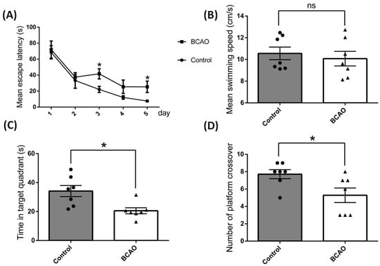 Cognitive performance tested using a Morris Water Maze in bilateral common carotid artery occlusion (BCAO) rats after 4 weeks of ligation. The rats were tested at a designed time for five consecutive days. (A) Mean escape latency, (B) mean swimming speed, (C) time in target quadrant, (D) number of platform crossover measured. Data were expressed as mean ± SEM, * p < 0.05 versus the control rats; ns, no significance (n = 7).