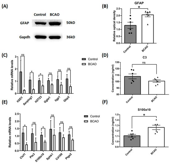 Reactive astrocyte phenotype in the cortex of BCAO rats after 4 weeks of ligation. (A,B) The protein levels of GFAP were tested using Western blot, and the data were normalized to Gapdh blot. (C) A1 reactive astrocyte phenotypes were tested using Real-time Quantitative PCR. (D) C3 protein concentration was tested using Elisa. (E) A2 reactive astrocyte phenotypes were tested using QPCR. (F) S100a10 protein concentration was tested using Elisa. Data were expressed as mean ± SEM, * p < 0.05 versus the control rats; ns, no significance (n = 6).