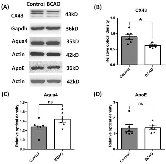 Reactive astrocyte function in the cortex of BCAO rats after 4 weeks of ligation. (A) Representative blots of CX43, Aqua4, and ApoE. (B–D) Ratios of CX43, Aqua4, and ApoE to Gapdh or Actin were calculated and compared. Data were expressed as mean ± SEM, * p < 0.05 versus the control rats; ns, no significance (n = 6).
