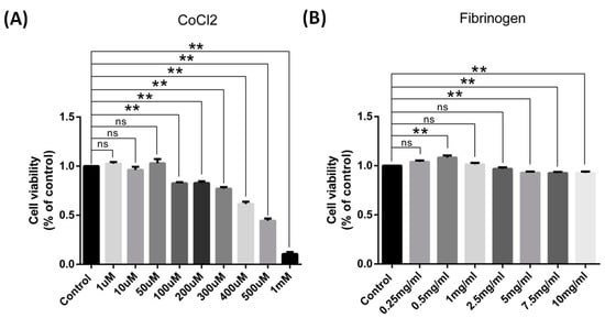Cobalt chloride and fibrinogen induced toxicity in cultured cortical astrocytes of rats for 24 h. (A,B) Cell viability was determined using a CCK assay. (A) CoCl2 caused a dose-dependent effect on astrocyte viability (n = 3). (B) The effect of fibrinogen was not concentration-dependent or prominent (n = 9). Data were expressed as mean ± SEM, ** p < 0.01 versus the control group; ns, no significance.