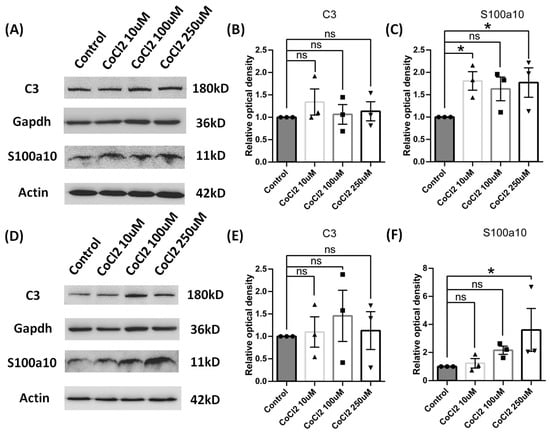 Reactive phenotype in cultured cortical astrocytes of rats by different concentrations of CoCl2 and time duration. (A–C) After 24 h, the protein levels of C3 and S100a10 were tested using Western blot, and the data were normalized to Gapdh or Actin blot. (D–F) After 96 h, the protein levels of C3 and S100a10 were tested using Western blot, and the data were normalized to Gapdh or Actin blot. Data are expressed as mean ± SEM, * p < 0.05 versus the control group; ns, no significance (n = 3).