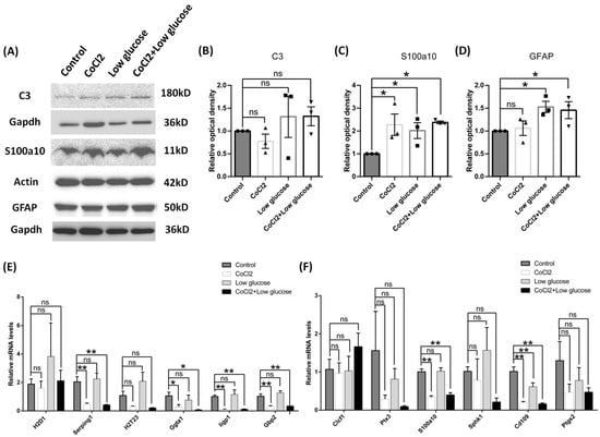 Reactive phenotype in cultured cortical astrocytes of rats by cobalt chloride and low glucose for 24 h. (A–D) The protein levels of C3, S100a10, and GFAP were tested using Western blot and the data were normalized to Gapdh or Actin blot. (E,F) A1 and A2 reactive astrocyte phenotypes were tested using QPCR. Data were expressed as mean ± SEM, * p < 0.05,** p < 0.01 versus the control group; ns, no significance (n = 3).
