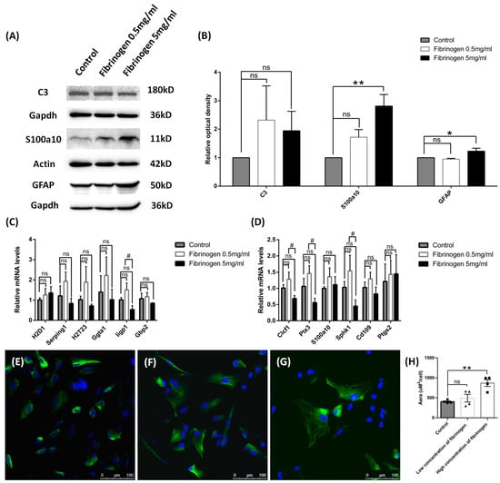 Reactive phenotype in cultured cortical astrocytes of rats by fibrinogen for 24 h. (A,B) The protein levels of C3, S100a10, and GFAP were tested using Western blot, and the data were normalized to Gapdh or Actin blot. (C,D) A1 and A2 reactive astrocyte phenotypes were tested using QPCR. (E–G) Immunofluorescence staining of GFAP using control (E). Low concentration of fibrinogen and (F) high concentration of fibrinogen (G). (H) Analysis of cell area in immunofluorescence staining of GFAP. Data are expressed as mean ± SEM, * p < 0.05, ** p < 0.01 versus the control group; # p < 0.05, high concentration versus low concentration of fibrinogen group; ns, no significance (n = 3).