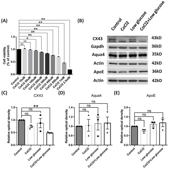Effects of C6 cells by cobalt chloride or low glucose for 24 h. (A) Cell viability was determined using a CCK assay, and CoCl2 caused a dose-dependent effect on C6 cell viability. (B) Representative blots of CX43, Aqua4, and ApoE. (C–E) Ratios of CX43, Aqua4, and ApoE to Gapdh or Actin were calculated and compared. Data were expressed as mean ± SEM, * p < 0.05, ** p < 0.01 versus the control group; ns, no significance (n = 3).
