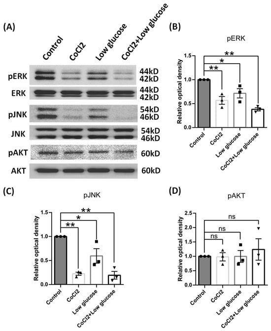 Signal pathway proteins of C6 cells by cobalt chloride or low glucose for 24 h. (A) Representative blots of pERK, pJNK, pAKT. (B–D) Ratios of pERK, pJNK, pAKT to ERK, JNK, and AKT were calculated and compared. Data were expressed as mean ± SEM, * p < 0.05, ** p < 0.01 versus the control group; ns, no significance (n = 3).