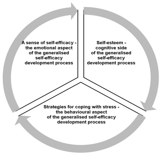 - a sense of self-efficacy, which refers to the individual’s belief in their ability to exhibit behaviors necessary to achieve specific outcomes [6,7], so it reflects confidence in the individual’s ability to exert control over their motivation, behavior, and social environment, giving it the character of the emotional aspect of a sense of general self-efficacy—the ability to manage emotions internally rather than externally. A person who is confident in their self-efficacy is more motivated to overcome any encountered obstacles, has a more positive attitude towards tasks, and is sure that they can handle them;