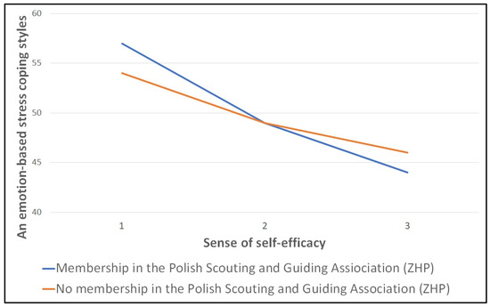 They indicate the results of two regressions—membership/no membership in the Scout Movement as a predictor of manner in coping with stress through emotions in relation to the intensity of a sense of self-efficacy. The analyses performed suggest that membership in the Scout Movement has a significant moderating effect on the relationship between variables X and Y, and therefore that, depending on membership/no membership, the relationship between a sense of self-efficacy and the intensity of the tendency to choose an emotion-based stress coping style varies (this is how the interaction works). In the remaining cases (Models 1–2, 4–6), there was no significant moderating effect, as the value of the interaction effects was not statistically significant.