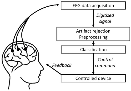 Brain-computer Interfaces (BCI) represent a rapidly evolving research field. As depicted in Figure 1, the general structure of these systems consists of physiological measurements of the brain, digitizing and processing the signal, and finally, giving commands based on the classification of the received data. These devices could provide significant help to people with different serious disabilities; however, reliable classification accuracy is essential for use in real life [1,2]. Non-invasive EEG measurements can be conducted more easily than invasive ones because they do not require surgery preparation. On the other hand, the classification accuracy is poorer due to the distortion from the various tissues between the source and the recording electrode and the lower resolution.