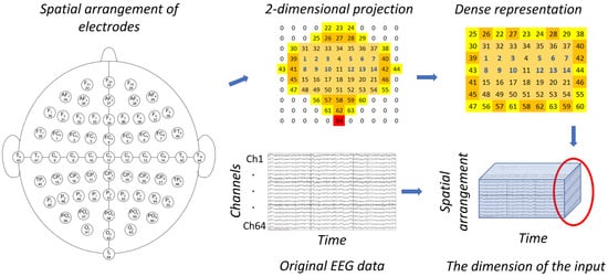 3D representation of the EEG data: the channels × time initial arrangement of the EEG data is rearranged into a three-dimensional form, where the first two dimensions refer to the spatial arrangement of the electrodes, while the third dimension is time. For the spatial dimension, we used a dense electrode arrangement. While the original distribution contains placeholder zero channels, we rearranged this map to have a dense representation with no such cells. We designed this input representation to investigate the effect of explicit involvement of the spatial arrangement of electrodes on the classification performance.