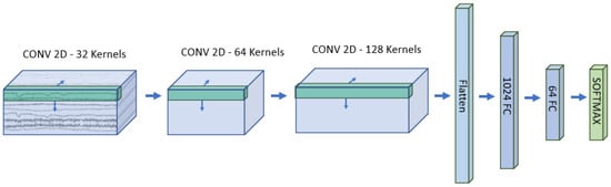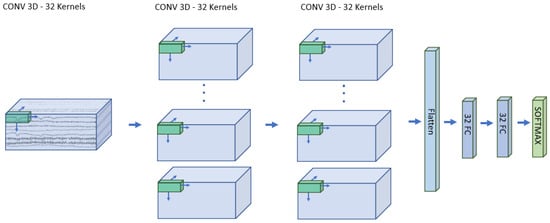 The structure of the 3D convolutional network. The input is identical to that of the 2D CNN. The difference is that in this structure, three-dimensional convolution is performed. There are 32 kernels in all the layers. The shape is (1 × 1 × 30) in the first and (2 × 2 × 40) in the second and third layers. The fully connected part consists of two layers with 32 neurons each, and finally, a softmax classification layer.