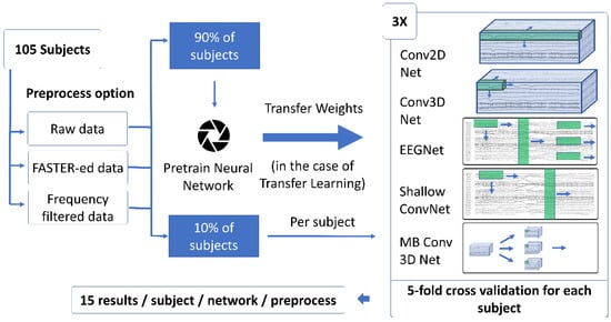 Transfer learning and the generation of results. To have statistically significant results, we performed a 5-fold cross-validation for each subject three times, resulting in 15 results for each subject, network, and preprocess option. 90% of the subjects’ data is used for pre-training the classifier, which is fine-tuned over individual subjects’ training sets. The whole process iterates 10 times for every subject to be tested.