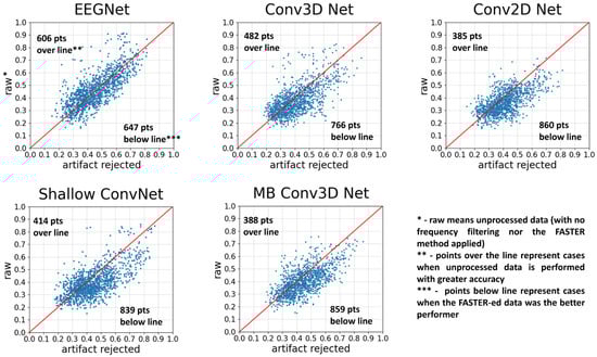 The comparison of neural networks with and without using the FASTER method. Each point represents two accuracies for a subject: the one obtained with AR and the other obtained without using the FASTER algorithm. The test was run 12 times to obtain significant results. The red line indicates the points with no difference between the two options, points over the line run with the raw option as the more accurate, and points below the line where the artifact-rejected version yields better results.