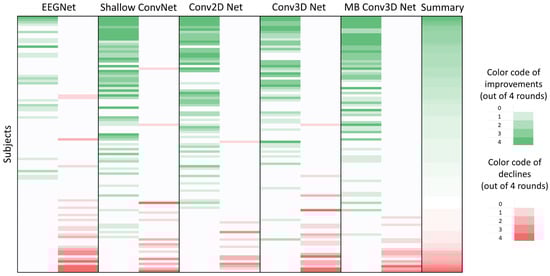 In our assessment, to each subject, a numerical score was assigned, denoted as follows: a value of −1 indicated a significant decline, 0 denoted no significant difference, and +1 represented a discernible increase observed for each computational aspect across all networks. Therefore, the cumulative score per subject ranged from −20 to 20. Twenty-five subjects scored over 8, indicating substantial performance gains from the AR method, with Subject 69 achieving a remarkable 20-point increase. Conversely, some subjects, like Subject 15, experienced significant declines, with only five subjects scoring below −8. Regarding classifiers, EEGNet showed the least improvement, with only three subjects scoring at least 3, while six scored below −3. In contrast, the other four networks had at least 20 subjects exceeding the three-point mark, with fewer than five scoring −3 or worse. The subject dependence on AR is illustrated in Figure 7.
