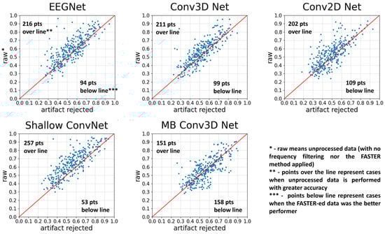 In conclusion, our research indicates that the FASTER method can enhance performance in a subject and network-specific manner. There are subjects where the application of AR comes with an efficiency increase, while in other cases, it comes with the deterioration of the results. Transfer learning proved to be effective in improving the performance of all networks in both raw and artifact-rejected data. However, it was noted that the accuracy of classification for artifact-rejected data did not improve as significantly as it did for the unfiltered data, resulting in less precision. Our findings also revealed an unexpected outcome from frequency filtering, as the tested networks demonstrated strong classification performance based on the low-frequency components during learning. Notably, we observed that higher frequency ranges were more discriminative in the case of EEGNet and Shallow ConvNet when cropped training was applied. In summary, the study underscores the intricate interplay between processing techniques and neural network performance, highlighting the necessity for tailored processing approaches designed for specific subjects and network architectures.