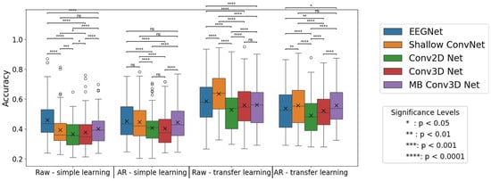 The accuracies obtained by neural networks, with and without transfer learning and artifact-rejection. In the box plot, x denotes the mean, while the horizontal line marks the median value. The limits of the box indicate the range of the central 50% of the data. Significance levels were determined using the Wilcoxon test. (The notation ‘ns’ denotes non-significant differences.) Before applying the TL method, EEG Net was the greatest performer, while after the application, Shallow ConvNet had the highest accuracy. These observations are generally true for the raw and the artifact-rejected data as well. However, for AR-ed data without TL, this difference is non-significant. The figure also presents that without transfer learning, networks generally perform better with the FASTER method, while after the application, raw data will attain a higher precision.