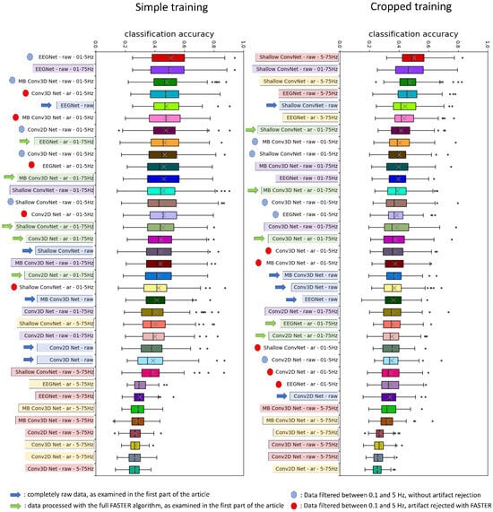 The results obtained with and without cropped training ordered by the classification accuracy. Arrows mark the cases examined in the first part of the article: the differences between the FASTER-ed (green arrow) and the fully raw data (blue arrow). The relation between the two datasets remains the same, as only the EEGNet yields a better raw classification accuracy. However, during cropped training, Shallow ConvNet also joined this group. Dots marked the results when frequency filtering was presented between 0.1 and 5 Hz. (Red dots for artifact rejected and blue dots for raw data). Without cropped training, these results tend to be unexpectedly high, yielding that this low-frequency range contains the most relevant information for MI classification on the Physionet database when subject-vise learning is performed without any augmentation of the training dataset. In the other cases, the color of the bars represents the corresponding preprocessing option. The most noteworthy result is that while during simple learning, almost every 5–75 Hz filtered attempt was presented on the lowest part of the list, the cases of EEGNet and Shallow ConvNet jumped to the first places of the cropped training results, corresponding to the extensive literature.