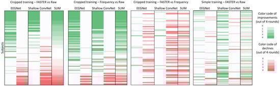 Subject-wise effect of the FASTER artifact rejection method and the frequency filtering on the classification performance of the EEGNet and Shallow ConvNet, related to the raw data, during cropped and simple training. The shade of the color means the number of significant increases (green) or declines (red) out of the four tests. Subjects are ordered by the score achieved during the AR method compared to the unfiltered data. The order of the subjects is almost the same in the second graph, meaning that frequency filtering has a similar subject-wise effect as the FASTER algorithm related to the raw data. However, this sequence is merely different from the result from the first part of the article, meaning that during cropped training, it changes on which subjects the AR has positive effects. The sequence is also different on the FASTER compared to the plain frequency filtering graph, where, for most of the subjects, the AR method caused a significant decline. It means that during cropped training, it is more advised to filter only the appropriate frequency ranges and not to use the more complex FASTER method to obtain better results.