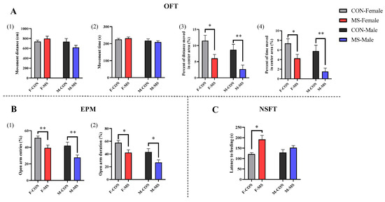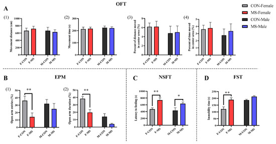 4.1. One-Week MS Induced Sex-Specific Anxiety- and Depression-like Behaviors in Offspring Rats During Adolescence and Adulthood