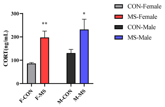 3.4. Effect of One-Week MS on Serum Corticosterone (CORT) of Offspring Rats