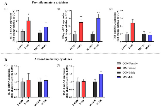 3.5. Effect of One-Week MS on Hippocampal Inflammatory Cytokines of Offspring Rats