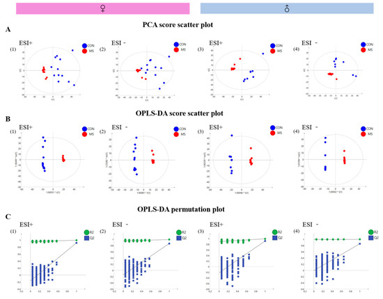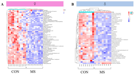 | Metabolites | RT (min) | m/z | Adduction | Female CON vs. MS | Male CON vs. MS |