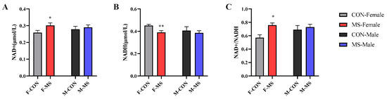 3.7. Effect of One-Week MS on Hippocampal NAD+ and NADH of Offspring Rats