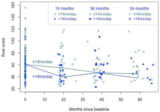 Table 6 shows estimates of Equation (2) for the CI participants classified by CI usage. Focussing on the 18-month results for executive function (GMLT), the mean change from baseline for low-use participants was estimated to be , and the additional change from baseline for high-use participants was , significant at the 5% level following Holm–Bonferroni correction. While the mean GMLT score across all participants did not significantly improve by 18 months, these results imply the mean GMLT score did improve by 18 months for participants with high CI usage. The differences in GMLT between high and low CI usage at 36 and 54 months were not significant. These results are illustrated in Figure 1. The significant improvement at 18 months for those with high usage (>14 h per day) is evident from the steeper decline than for those with lower usage (14 h per day). The overall improvement for all participants by 36 and 54 months is evident from the decline in both means by these time points.
