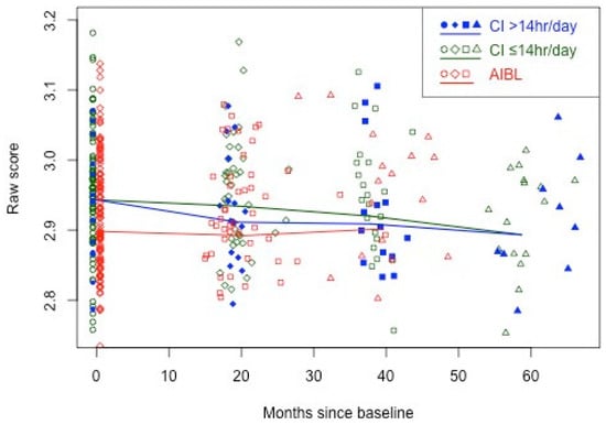 3.3.2. Cognitive Trajectories of the CI and AIBL Groups