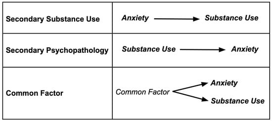 Three explanatory models about the potential causal impacts of chronic anxiety on substance use (and vice versa) are discussed in this review (Figure 1). These three models are not mutually exclusive, as we will present throughout the paper [10]. First, having a psychiatric disorder increases susceptibility to addictive behaviors because certain substances may temporarily reduce symptoms of mental conditions and act as a negative reinforcer [11]. This is termed the secondary substance use model and embraces the self-medication hypothesis, in which the constant use of substances to remedy the negative affect states of psychiatric conditions leads to an SUD diagnosis [12]. Social anxiety disorder (SAD) has been identified as an example of such a relationship, but for other anxiety disorders, the temporality with SUD development remains unclear [13]. Second, the secondary psychopathology model proposes that SUDs may promote vulnerability to anxiety disorders due to the consequences of chronic drug use or related withdrawal symptoms [12,14]. A study using National Epidemiological Survey on Alcohol and Related Conditions (NESARCs) data found a higher likelihood of individuals having alcohol use disorder (AUD) as their primary diagnosis among patients with comorbid panic disorder or generalized anxiety disorder [13]. Third, the common factor model suggests that shared genetic and environmental factors (e.g., traumatic or stressful life experiences) may mediate the relationship between SUDs and anxiety rather than reflect a direct causal association [12,15,16]. The self-medication hypothesis in the secondary substance use model appears to be the most commonly used explanation for comorbid SUDs and anxiety. The literature has demonstrated empirical evidence that supports this hypothesis in comorbid social phobia and AUD, as well as comorbid post-traumatic stress disorder (PTSD) and SUDs. However, since various anxiety disorders interact differently with different SUDs, there are potentially other mechanisms that explain their comorbidity [12]. Neurobiological study of the pathogenesis and evolution of comorbid SUDs and anxiety disorders is crucial to investigate these models, advance treatment, and improve outcomes.