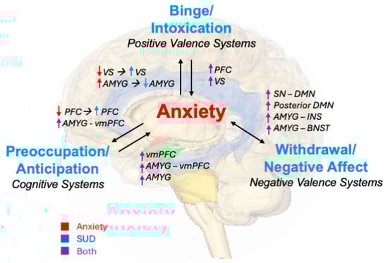 One approach for the purpose of investigating psychiatric comorbidities is to use the Research Domain Criteria (RDoC), a multi-system framework that maps domains of neurobehavioral functioning to mental disorders. Since its conception in 2008, RDoC has been established as a valid framework that is particularly valuable when studying comorbidities due to its multidimensional approach (e.g., integrating neurobiological and psychosocial factors) and focus on common underlying constructs of multiple disorders (e.g., disruption to positive valence systems as a core feature of both SUDs and anxiety) [17,18]. Prior studies have successfully applied the RDoC framework to produce clinically relevant insights for depressive, personality, and psychotic disorders [19,20,21]. The RDoC framework is a step toward precision psychiatry [22], with one of its greatest strengths being its ability to guide “attempts to associate underlying psychological constructs of cognition and emotion with specific neural circuitry” [23]. Though the RDoC is a strong framework, one notable weakness is the lack of recognition of the dynamic nature of psychiatric illness onset and progression [23]. We aim to address this by discussing the potential impact of early life stress on one’s probability to engage in substance use through the reciprocal and causal effect of anxiety and the SUD cycle. Current neuroimaging studies provide valuable insights about the neural underpinnings of anxiety or SUDs, and the RDoC framework provides a unified way to integrate the two veins of research to identify novel transdiagnostic biomarkers for treating their comorbid presentations. Here we examine SUD-AD comorbidity through this lens, conducting a narrative review of studies that highlight limbic system neuroadaptations associated with these disorders.