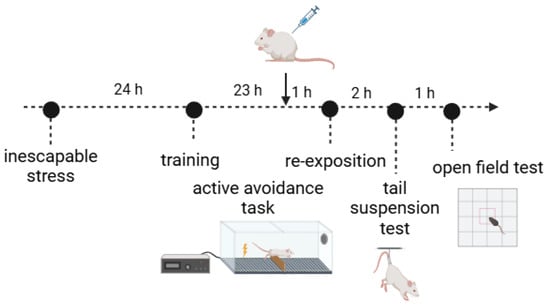 The active avoidance task uses aversive stimuli (unconditioned, e.g., footshock) to create an associative memory. Usually, animals learn to escape from aversive stimuli by moving to the opposite side of a shuttle-box, then associating the arrival of the unpleasant stimuli with the light provided beforehand (e.g., conditioned stimuli) []. The understanding of the biological bases of avoidance memories and the ability of psychotropic drugs to modulate them are worth studying. Timing is a relevant aspect to be aware of when investigating the effects of drugs on aversive memories. For example, the effects of administering ketamine before acquisition of a task are clinically relevant for prophylactic treatments. By contrast, the effects of drug administration immediately after a training test mimics trauma analgesia, while a delayed dose of a drug after consolidation of a fear memory or prior to extinction training simulates a therapeutic modality to reopen the processing of reprogramming an avoidance information (for a review, see Choi et al. []).