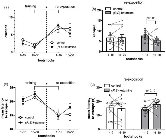 Effects of (R,S)-ketamine, 10 mg/kg, ip, administered 1 h before the re-exposition session, on the active avoidance task performed in stressed mice. (a) Frequency of and (c) mean latency to escape from the electrified side of the box in the training and re-exposition sessions, and (b) frequency of and (d) mean latency to escape in the re-exposition session of the active avoidance task. Data represent the mean ± SEM, while dots represent individual performance. (R,S)-ketamine: n = 9, and control: n = 11. (a,c) RM ANOVA, Tukey’s test: * p < 0.05 vs. 16–30 training session; (b,d) paired t-test: footshocks 16–30 vs. 1–15.