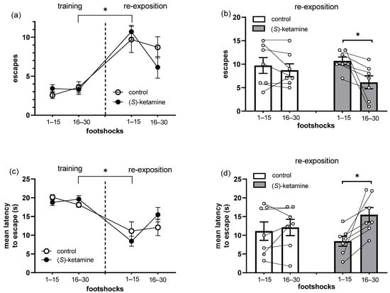Effects of (S)-ketamine, 10 mg/kg, ip, administered 1 h before the re-exposition session, on the active avoidance task performed in stressed mice. (a) Frequency of and (c) mean latency to escape from the electrified side of the box in the training and re-exposition sessions, and (b) frequency of and (d) mean latency to escape in the re-exposition session of the active avoidance task. Data represent the mean ± SEM, while dots represent individual performance. (S)-ketamine: n = 7, and control: n = 7. (a,c) RM ANOVA, Tukey’s test: * p < 0.05 vs. 16–30 training session; (b,d) paired t-test: footshocks 16–30 vs. 1–15.