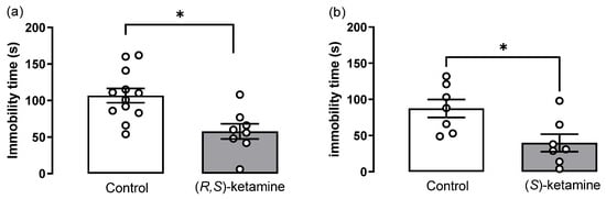We next evaluated the effects of (R,S)- and (S)-ketamine in the immobility behavior of stressed mice (Figure 4). The treatment with (R,S)-ketamine 10 mg/kg significantly reduced the immobility time compared to the control group (Figure 4a, t-test: t(17) = 3.1, p = 0.006). Similarly, the treatment with (S)-ketamine 10 mg/kg significantly reduced immobility time compared to the respective controls (Figure 4b, t-test: t(12) = 2.7, p = 0.018).