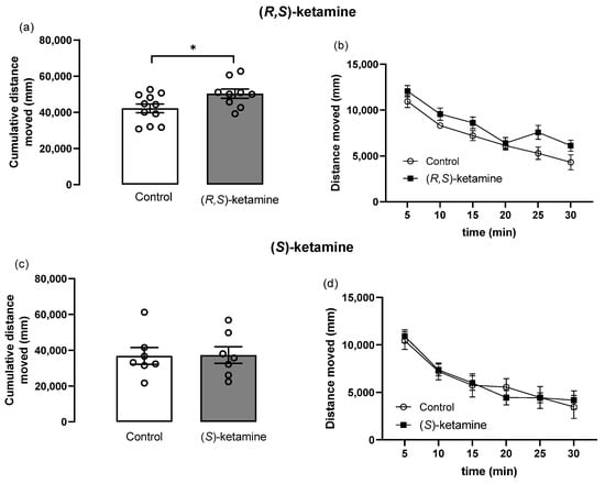 Effects of (R,S)-ketamine and (S)-ketamine (both 10 mg/kg, ip, 4 h before testing) on the spontaneous locomotion of mice previously exposed to inescapable stress. Total distance moved and distance moved in 5 min blocks over time in the (R,S)-ketamine (a,b) and (S)-ketamine (c,d) groups. Bars represent the mean ± SEM, while dots represent individual performance. (R,S)-ketamine: n = 9, control: n = 11; (S)-ketamine: n = 7, control: n = 7. * p < 0.05 vs. control, unpaired t-test.