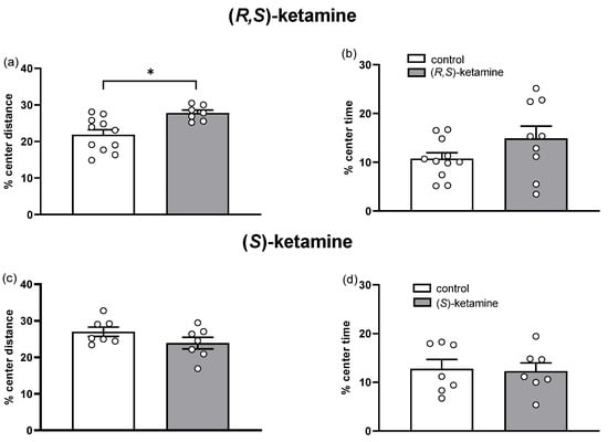 The open field test was performed in an arena (40 × 40 × 40 cm) approximately 4 h after treatment with (R,S)-ketamine, (S)-ketamine, or saline (Figure 1). The test was performed in a soundproof room under dark conditions, and the arena was cleaned with a 5% ethanol solution between animals. Each mouse was placed in the center of the open field, and the exploration behavior over 30 min was recorded by an infrared video camera connected to a computer and subsequently analyzed using Anymaze® video tracking software (Stoelting Co., Wood Dale, IL, USA). This test aimed to assess spontaneous locomotion and anxiety-related behaviors by the exploration to the central area. The following parameters were recorded: total distance moved (in meters) over 30 min, and time spent (in seconds) and distance moved in the center (20 × 20 cm) zone of the arena during the first 10 min of exposition. The % center time was calculated by dividing the time spent in the center by 600. The % center distance was obtained by dividing the distance moved in the center zone by the total distance moved in 10 min. Increased exploration time in the central zone indicates anxiolytic-like behaviors, while a decrease suggests anxiogenic-related behavior [].