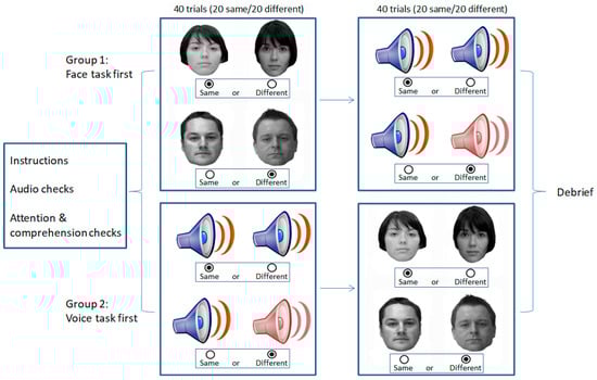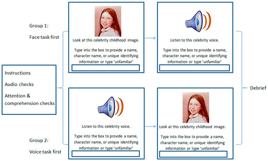 Participants were randomly assigned to one of two groups which differed only in the order of the face and voice tasks. This aside, the tasks were identical, and are illustrated in Figure 3.