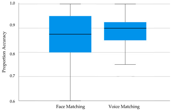 A within-participants design was used in which participants completed an unfamiliar face matching task (the Glasgow Face Matching Test-short version [GFMT]) and a bespoke unfamiliar voice matching task. This was used rather than a standardised voice matching task, given the desire to measure voice processing using stimuli that went beyond short vowel sounds. Accuracy was scored in the published way for the GFMT to allow comparison to published norms. This yielded an overall score (out of 40). For comparability, the unfamiliar voice matching task was also scored to yield an overall accuracy score (out of 40). Both scores were converted to proportions for the purposes of analysis.
