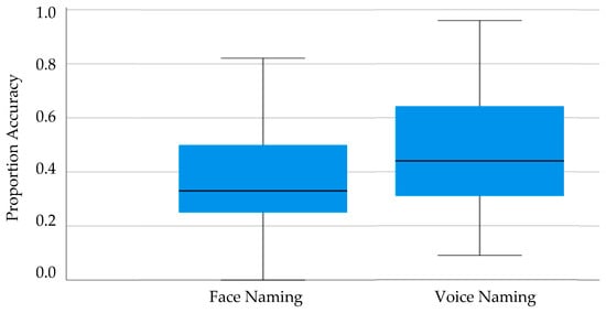 Face processing has been highlighted as an exceptional capability, particularly when stimuli are familiar [1]. Even after a brief exposure, faces can often be recognised, and while changes to appearance can make identification harder, familiarity with a target means that they can often be identified despite such changes [2,3]. In contrast, voice recognition appears to be a more difficult task. In careful laboratory experiments, voices are more likely to elicit familiarity-only reactions or tip-of-the-tongue states [4,5,6], and they are less likely to enable the retrieval of episodic or semantic information about a known speaker [7,8,9]. More recent work using the Famous People Recognition Battery suggested that the accuracy when naming famous people from their faces was 84.4%, while the accuracy when naming from their voices was significantly worse at only 66.0% [10]. Such findings have been used to focus the research effort on accounting for cognitive and neuropsychological differences between face and voice processing (for example, see [11,12]).