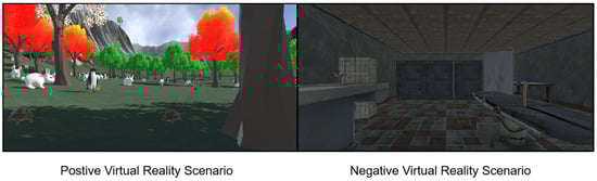Initially, we carefully selected four positive and four negative one-minute scenes for our study, as shown in Figure 1. To validate the suitability of our scene choices, we conducted a pre-experiment where twenty individuals evaluated the emotional content of the VR scenes. Notably, the participants could easily distinguish between positive and negative scenes. Subsequently, the required group size was determined using the G*Power program [22]. For our repeated measures analysis of variance (ANOVA), we set α = 0.05, effect size = 0.25, and a desired power (1 − β) of 0.8, obtaining a group size of 28. Similarly, for the paired t-test, we employed a two-sided test, set α = 0.05, effect size = 0.5, and aimed for a power (1 − β) of 0.8, resulting in a group size of 34. Ultimately, 42 healthy volunteers, with a sex distribution of 21 males and 21 females, with a mean age of 22.8 years and a standard deviation (SD) of 1.81 years, participated in our study. The number of participants exceeded the theoretical requirements. All participants were affiliated with Shanghai University and provided informed consent before the experiment. The participants received compensation for their participation. The experimental protocol was approved by the Shanghai Ethics Committee for Clinical Research and adhered to the principles outlined in the Declaration of Helsinki.