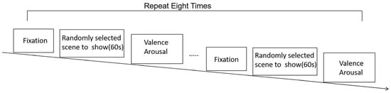 During the experiment, the participants sat comfortably, and scenes were presented using an HTC VR headset. Each scene was accompanied by background music, and the participants wore earphones for an immersive audiovisual experience. Eight unique scenes were randomly presented, and this process was repeated twice. Participants viewed each scene for one minute and then assessed their emotions in terms of both valence and arousal using a nine-point SAM scale [23]. Concurrently, behavioral data were collected. The experimental procedure is illustrated in Figure 2.