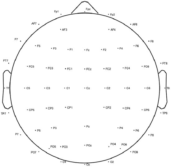 Simultaneously, EEG signals were recorded, while the participants viewed the VR scenes using a 64-channel wireless EEG system provided by Neuracle Technology in Changzhou, China. Electrode placement followed the international 10–20 system, and data were sampled at a rate of 1000 Hz, with electrode impedance maintained below 5 kΩ. The number and placement of electrodes are depicted in Figure 3. Resting-state EEG signals were recorded before the participants engaged in the scenes.